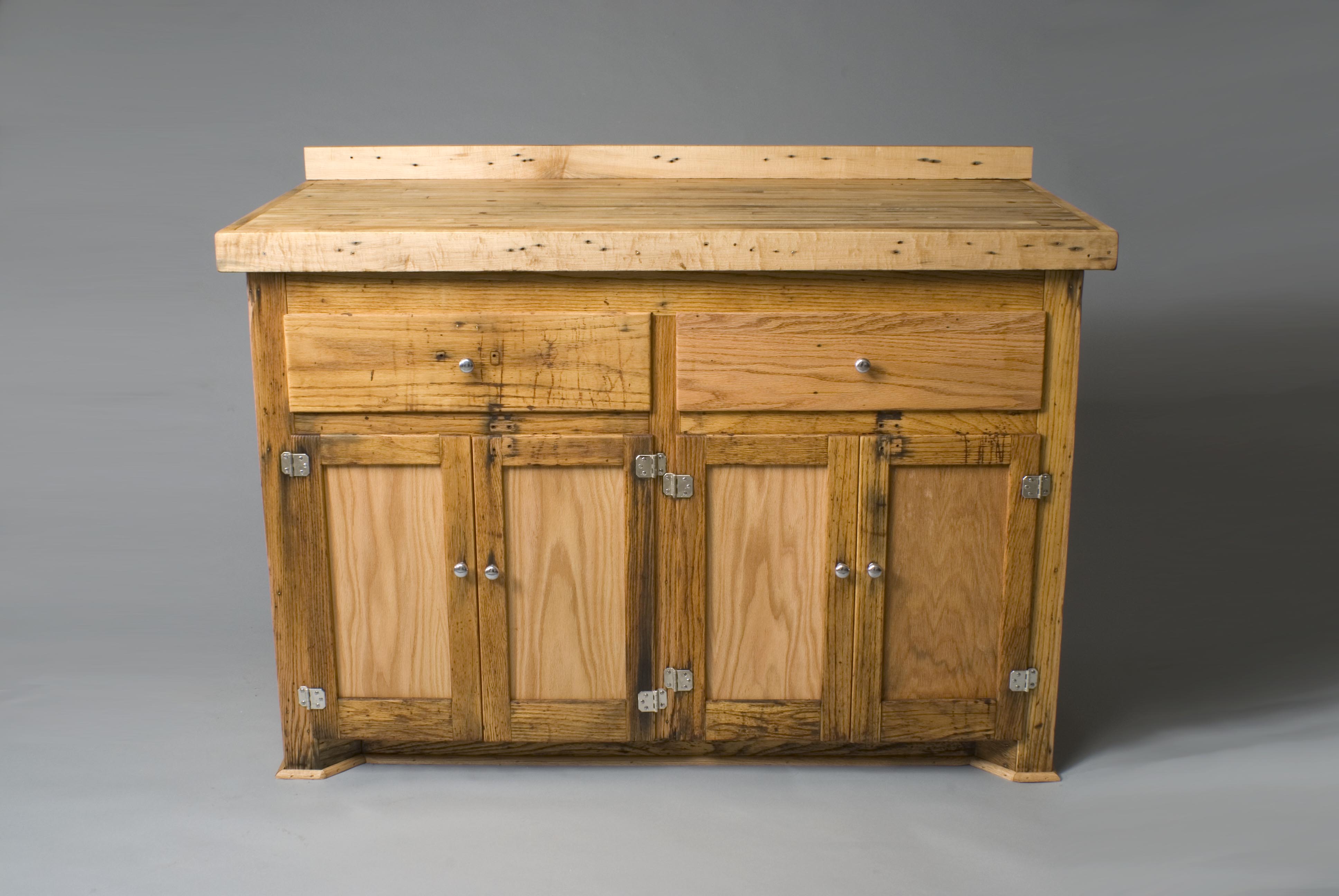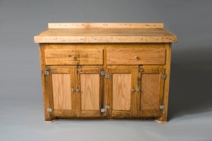 Here is a lab cabinet that came out of the Chem/Pharm building at the U of M when they remodeled a few years ago. I had to almost completely rebuild it because of all the “modifications” it had underwent over the years. It has some polished chrome hardware that was salvaged off other cabinetry and the top is made from salvaged maple bowling lane from Liberty Lanes. This was sold in 2009.