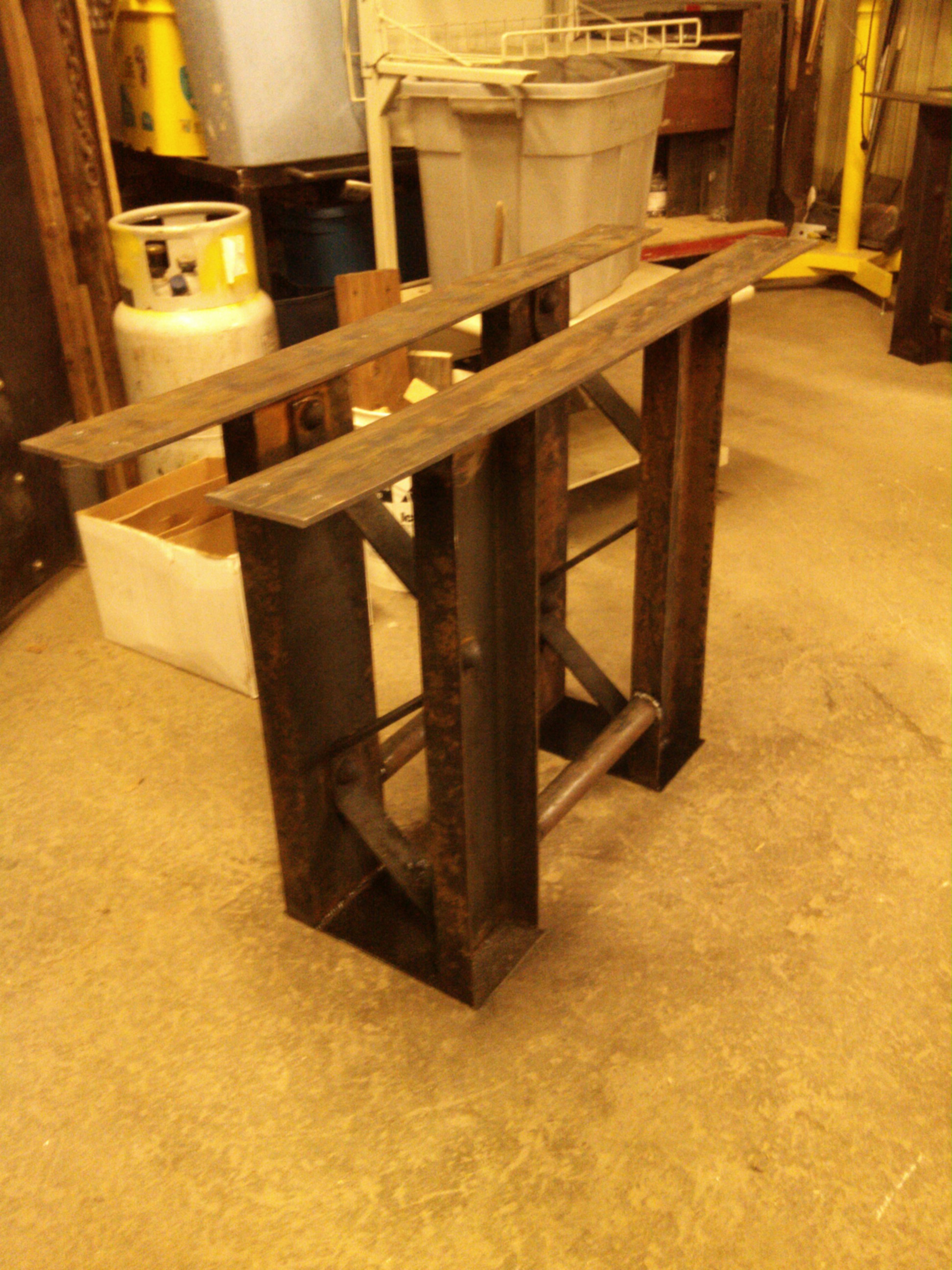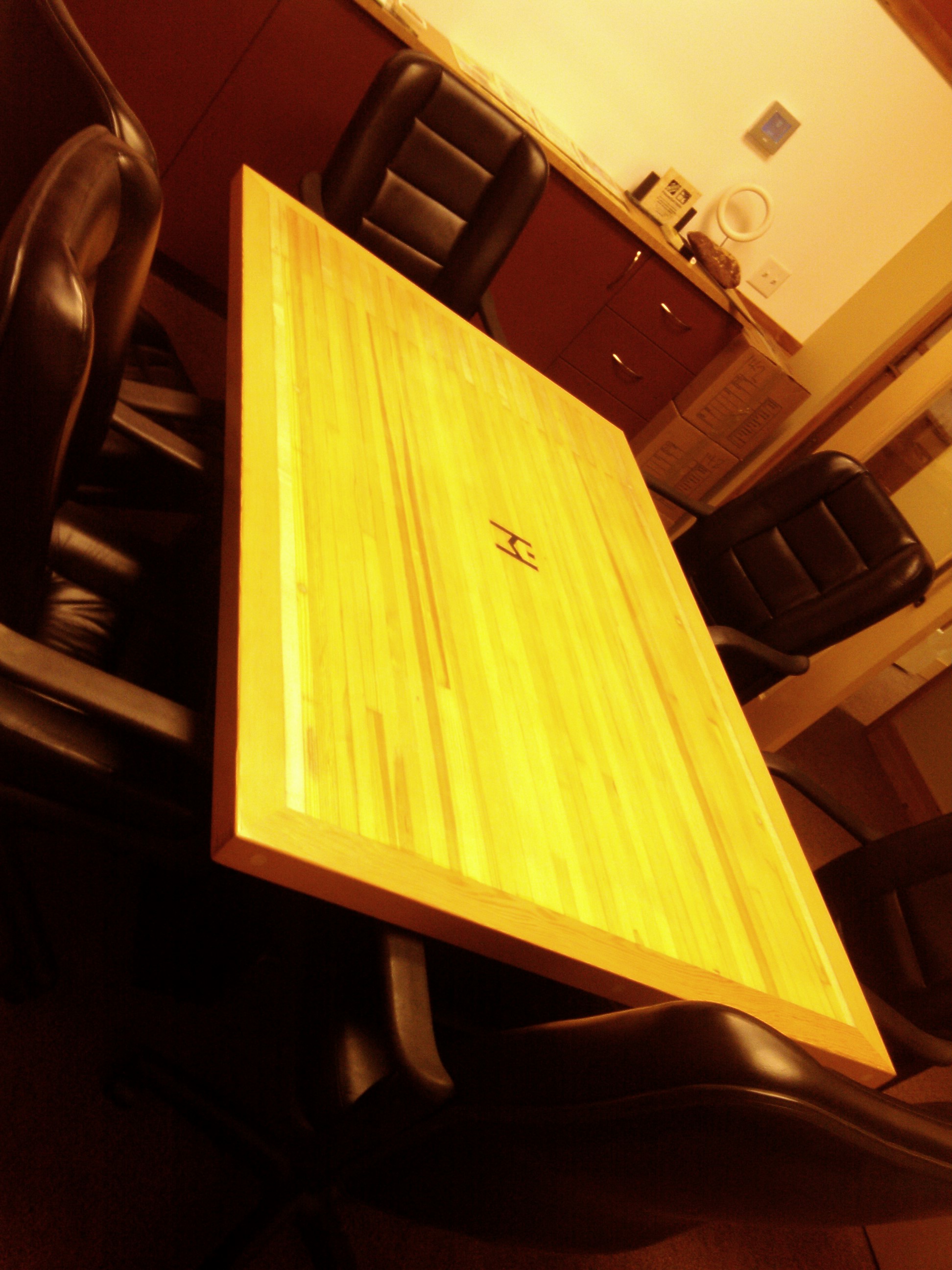 I just finished a conference table for local nonprofit heroes Homeword. The top is made of bowling lane and the legs are from an old steel bridge girder. The Homeword logo in the middle was routed out and filled with stained bondo.
